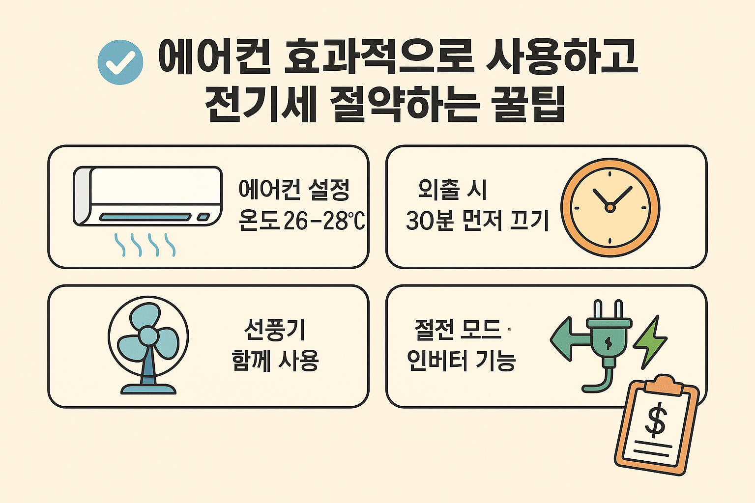 - 실내외 온도차를 5~7℃ 이내로 유지하면 전기 절약 + 냉방병 예방.