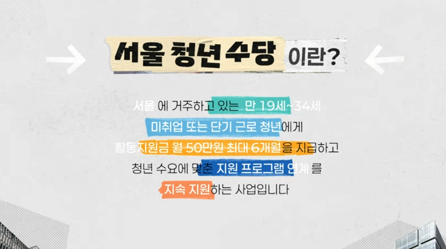 청년수당이란? 서울에 거주하고 있는 만 19세~34세 미취업 또는 단기 근로 청년에게 활동지원금(월 50만원 최대 6개월)을 지급하고, 강점진단 종합지원, 멘토링, 취업지원 프로그램 제공 등 청년 니즈에 맞게 프로그램 연계를 지속 지원하는 사업입니다.