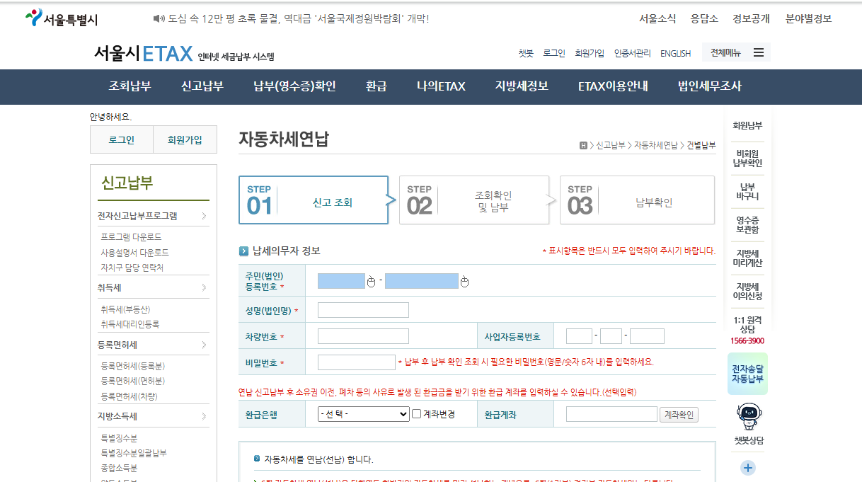 - 자동차세 조회 후 연납 신청 및 결제 진행