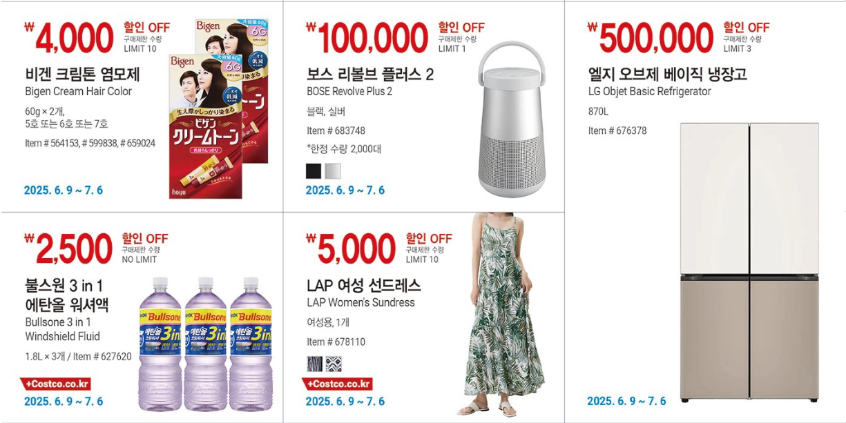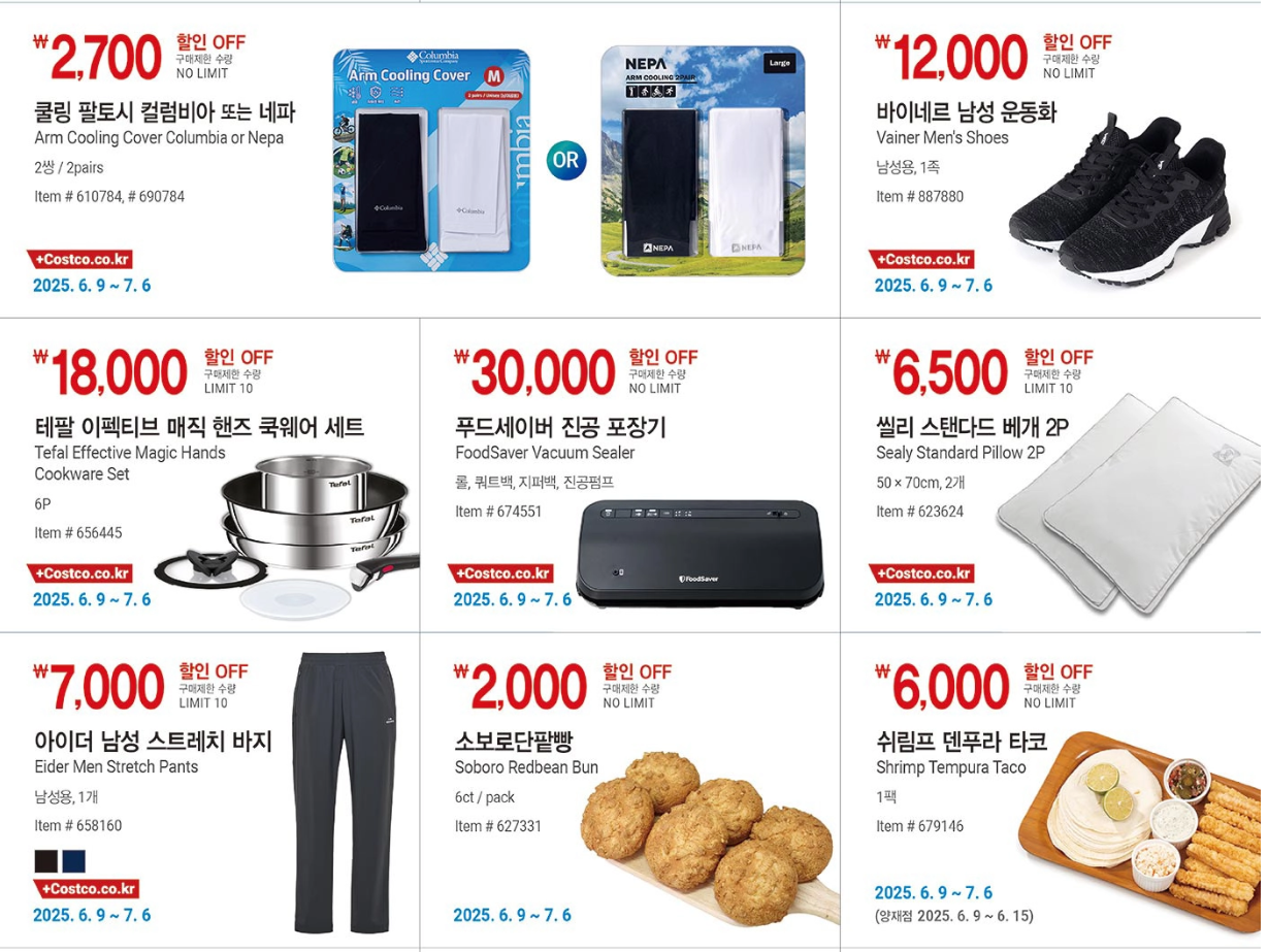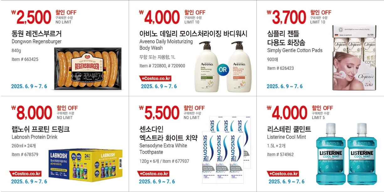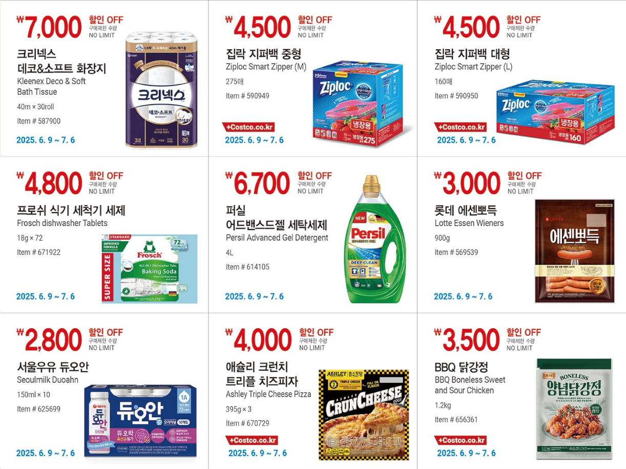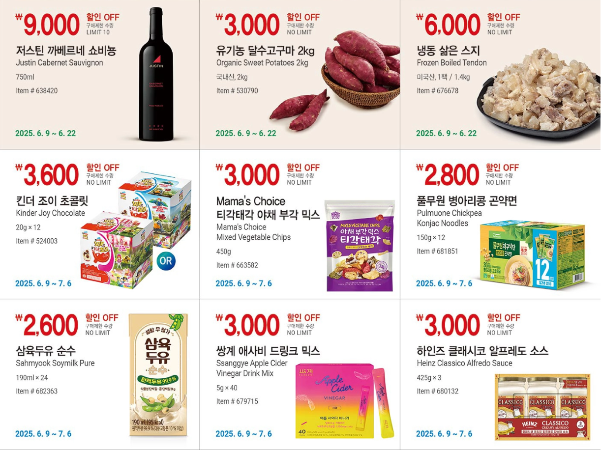 2025년 6월 9일부터 7월 6일까지 진행되는 코스트코 회원 한정 할인행사! 식품, 생활용품, 가전, 의류 등 주요 품목을 카테고리별로 정리했습니다. 와인, 냉장고, 프로틴 음료까지 품절 전 확인 필인하시고, 조기 품절 될 수 있으니 빠르게 서둘러 쇼핑하세요.