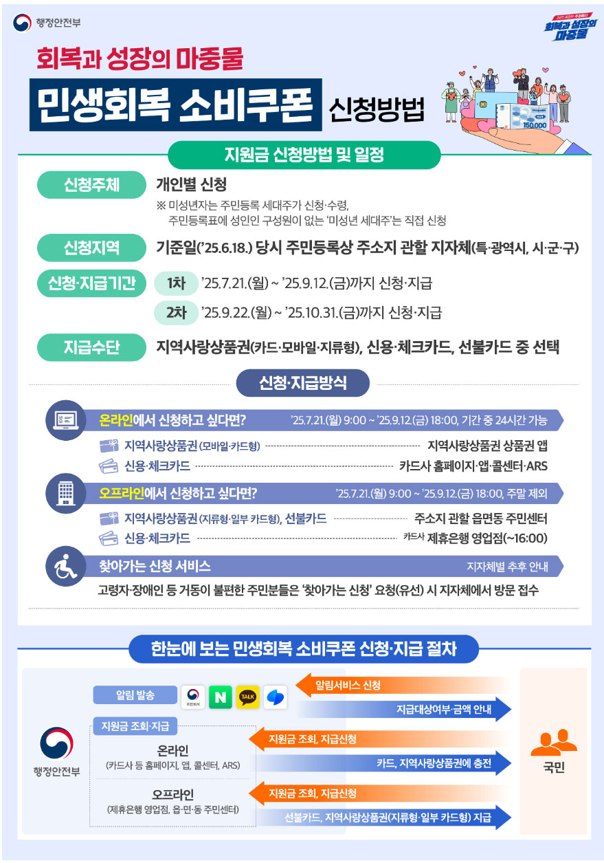2025년 정부는 민생경제 회복을 위해 전 국민을 대상으로 ‘민생회복 소비쿠폰’을 지급합니다. 1인당 최대 55만원까지 지원되며, 소득 수준과 거주 지역에 따라 차등 지급됩니다. 신용·체크카드, 선불카드, 지역사랑상품권으로 수령 가능하며 전통시장, 동네마트, 음식점, 약국 등에서 사용할 수 있습니다. 백화점, 대형마트, 온라인몰 등에서는 사용이 제한됩니다. 신청 기간과 사용처를 아내 내용에서 꼭 확인하세요.